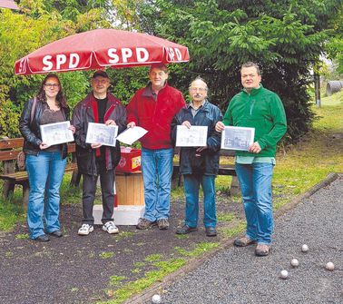 Fesndorf. Das regnerische Wetter am letzten Sonntag hielt die Teilnehmer am SPD-Boule-Turnier auf dem Fensdorfer Boule-PLatz nicht davon ab, ein kleines Turnier zu absolvieren. Mit coolen Sprüchen und Frotzeleien trotzten die gut gelaunten Fans des französischen Kugelspiels den Wetterkapriolen.